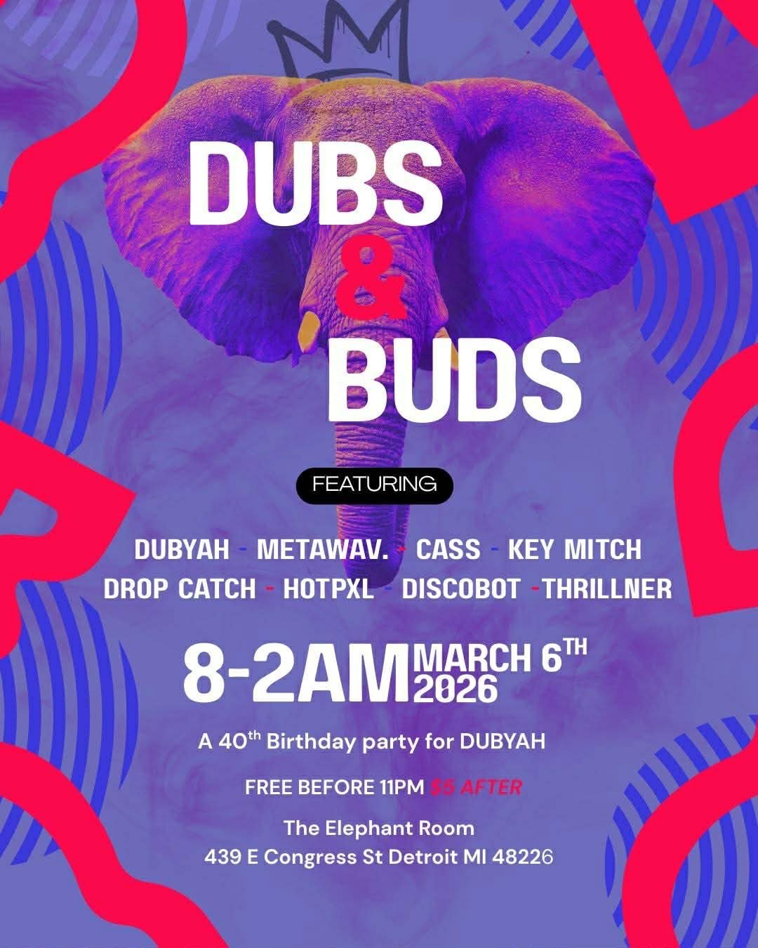 Celebrate Ryan’s 40th Birthday with a night of music and good vibes at The Elephant Room in Detroit. Featuring Dubyah, Metawav, Cass, Key Mitch, Drop Catch, HotPXL, DISCOBOT, and Thrillner. March 6, 2026 • 8PM–2AM • Free before 11PM, $5 after.